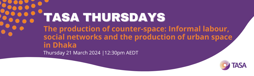 Join us on Thursday 21st March 2024, for this month's TASA Thursday session which will be presented by guest speaker Dr Lutfun Nahar Lata. This session is titled "The production of counter-space: Informal labour, social networks and the production of urban space in Dhaka."